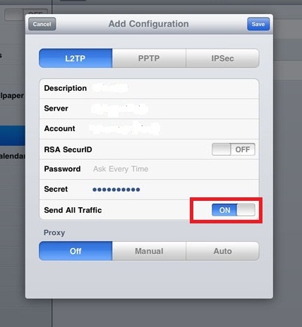 أدخل Description و Server و Account وPassword و Secret وقم بتشغيل Send All Traffic